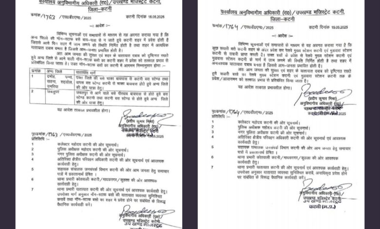 कटनी जिले में अब अन्य जिलों से आने वाली नान स्टाप बसों का प्रवेश प्रतिबंधित, एसडीएम कटनी ने शहर में यातायात के दबाव को कम करने की दृष्टि से जारी किया आदेश
