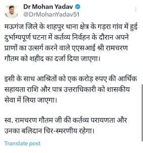 सीएम मोहन यादव ने मऊगंज हिंसा में जान गंवाने वाले ASI को शहीद का दर्जा दिए जाने के साथ परिवार को 1 करोड़ रुपये की राशि देने का किया ऐलान