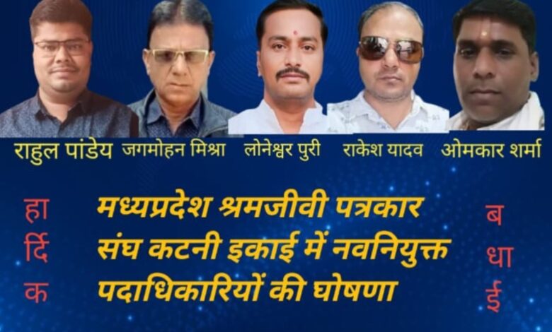 मध्यप्रदेश श्रमजीवी पत्रकार संघ कटनी इकाई में नवनियुक्त पदाधिकारियों की घोषणा, जगमोहन मिश्रा और राहुल पांडेय बने जिला उपाध्यक्ष, लोनेश्वर पुरी और राकेश यादव को मिली जिला सचिव की जिम्मेदारी, ओमकार शर्मा बने कार्यकारिणी सदस्य