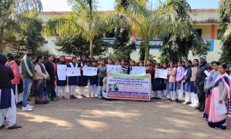 शासकीय उच्चतर माध्यमिक विद्यालय कन्हवारा में परियोजना अधिकारी श्रीमती विद्या पाण्डेय के नेतृत्व में जागरूकता कार्यक्रम आयोजित किया गया। विद्यार्थियों ने मानव श्रृंखला बनाकर बाल विवाह मुक्त समाज के निर्माण का संकल्प लिया।