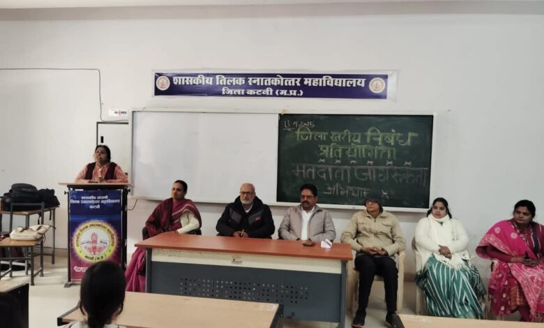 कलयुग की कलम कटनी-प्रधानमंत्री कॉलेज ऑफ़ एक्सीलेंस शासकीय तिलक स्नातकोत्तर महाविद्यालय कटनी में कलेक्टर एवं जिला निर्वाचन अधिकारी श्री दिलीप कुमार यादव, उप जिला निर्वाचन अधिकारी श्रीमती साधना परस्ते, के निर्देशन, प्राचार्य डॉ सुनील कुमार बाजपेई, प्रभारी प्राचार्य डॉ एमपी यादव के मार्गदर्शन में सोमवार 13 जनवरी को राष्ट्रीय मतदाता दिवस को लेकर जिला स्तरीय निबंध प्रतियोगिता वोट जैसा कुछ नहीं वोट जरुर डालेंगे हम थीम पर आयोजित हुई।