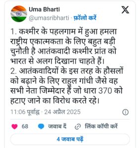 पूर्व सीएम उमा भारती ने एक्स पर पोस्ट करते हुए लिखा कि कश्मीर के पहलगाम में हुआ हमला राष्ट्रीय एकात्मकता के लिए बहुत बड़ी चुनौती है आतंकवादी कश्मीर प्रांत को भारत से अलग दिखाना चाहते हैं। आतंकवादियों के इस तरह के हौसलों को बढ़ाने के लिए राहुल गांधी जैसे वह सभी नेता जिम्मेदार हैं जो धारा 370 को हटाए जाने का विरोध करते रहे।