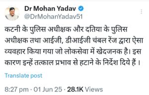 सीएम मोहन यादव ने सोशल मीडिया प्लेटफॉर्म एक्स पर पोस्ट कर लिखा- कटनी के पुलिस अधीक्षक और दतिया के पुलिस अधीक्षक तथा आईजी, डीआईजी चंबल रेंज द्वारा ऐसा व्‍यवहार किया गया जो लोकसेवा में खेदजनक है। इस कारण इन्‍हें तत्काल प्रभाव से हटाने के निर्देश दिये हैं। सीएम के इस पोस्ट के बाद पुलिस विभाग में हड़कंप मच गया।