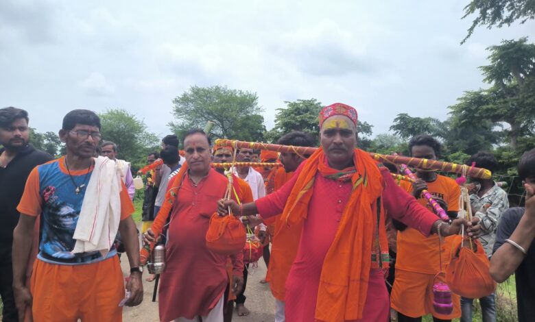 उमरिया पान हरदी नर्मदा माई तट से शुरू हुई कावड़ यात्रा नगर से होते हुए भरभरा आश्रम पहुंचकर कावड़ियों ने जलाभिषेक कर सुख समृद्धि की कामना की