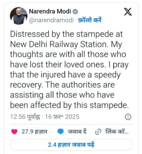 एक्स पर एक पोस्ट में प्रधानमंत्री मोदी ने कहा, “नई दिल्ली रेलवे स्टेशन पर हुई भगदड़ से व्यथित हूं। मेरी संवेदनाएं उन सभी लोगों के साथ हैं जिन्होंने अपने प्रियजनों को खो दिया है। मैं प्रार्थना करता हूं कि घायल लोग जल्दी ठीक हो जाएं। अधिकारी इस भगदड़ से प्रभावित सभी लोगों की सहायता कर रहे हैं।”