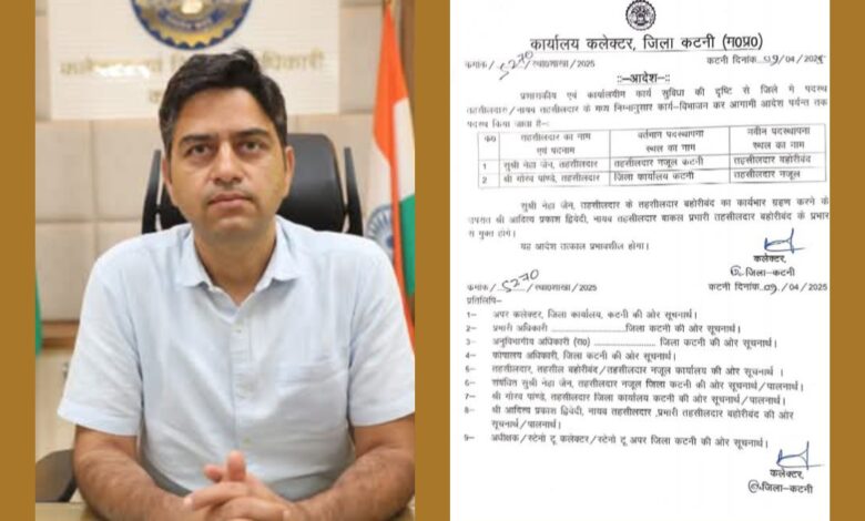 इसके अलावा जिला कार्यालय कलेक्ट्रेट में पदस्थ तहसीलदार गौरव पांडेय को तहसीलदार नजूल का दायित्व सौंपा गया है। इसी आदेश में उल्लेखित है कि नेहा जैन द्वारा तहसीलदार बहोरीबंद का प्रभार ग्रहण करने के बाद नायब तहसीलदार बाकल आदित्य प्रकाश द्विवेदी प्रभारी तहसीलदार बहोरीबंद के पद से मुक्त हो जायेंगे।