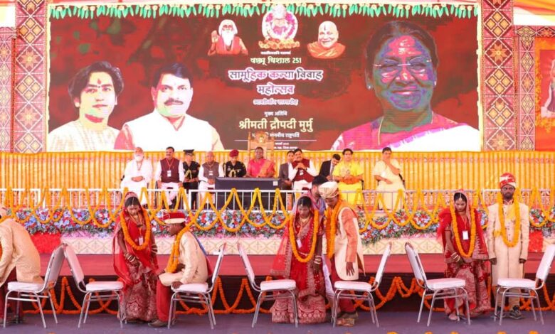 छतरपुर के खजुराहो स्थित बागेश्वर धाम में 251 जोड़ों का सामूहिक विवाह महोत्सव चल रहा है। कार्यक्रम में 251 जोड़ों को आशीर्वाद देने राष्ट्रपति द्रौपदी मुर्मू भी बागेश्वर धाम पहुंची। वे एयरफोर्स के विमान से खजुराहो एयरपोर्ट पर आईं। जहां राज्यपाल मंगूभाई पटेल और सीएम डॉ मोहन यादव ने उनका स्वागत किया। राष्ट्रपति वहां से हेलिकॉप्टर से बागेश्वर धाम पहुंचीं। जहां उन्होंने बालाजी मंदिर के दर्शन किए। दर्शन पूजन के बाद वे सामूहिक विवाह के लिए बने पंडाल के मंच पर पहुंचीं।