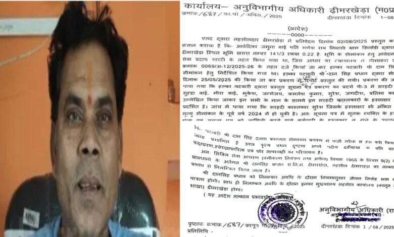 एसडीएम ढीमरखेड़ा निधि गोहल ने घोर लापरवाही बरतने वाले पटवारी पर की सख्त कार्यवाही, कर्मचारियों में मचा हड़कंप मृतकों की उपस्थिति में पटवारी ने किया सीमांकन तो एसडीएम ने कर दिया निलंबित निलंबित पटवारी दान सिंह के और कारनामों का जल्द होगा खुलासा