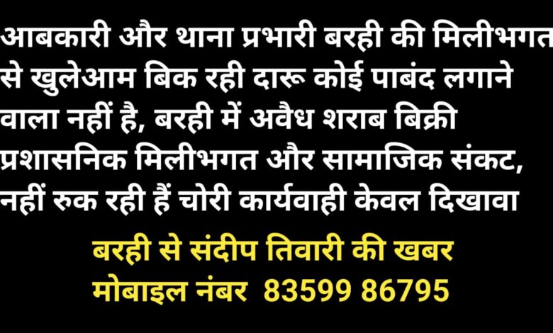आबकारी और थाना प्रभारी बरही की मिलीभगत से खुलेआम बिक रही दारू कोई पाबंद लगाने वाला नहीं है, बरही में अवैध शराब बिक्री प्रशासनिक मिलीभगत और सामाजिक संकट, नहीं रुक रही हैं चोरी कार्यवाही केवल दिखावा