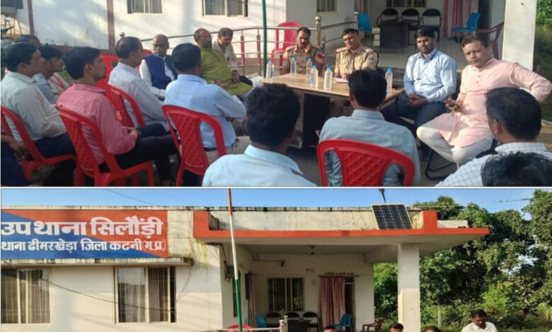 कलयुग की कलम सिलौडी -आगामी गणेशोत्सव एवं ईद मिलादुन्नबी पर्व को देखते हुए उपथाना सिलौडी परिसर में शांति समिति की बैठक संपन्न हुई। बैठक का आयोजन पुलिस अधीक्षक कटनी श्री अभिनय विश्वकर्मा के निर्देशानुसार, अतिरिक्त पुलिस अधीक्षक डॉ. संतोष डेहरिया एवं एसडीओपी स्लीमनाबाद सुश्री आकांक्षा चतुर्वेदी के मार्गदर्शन में किया गया।