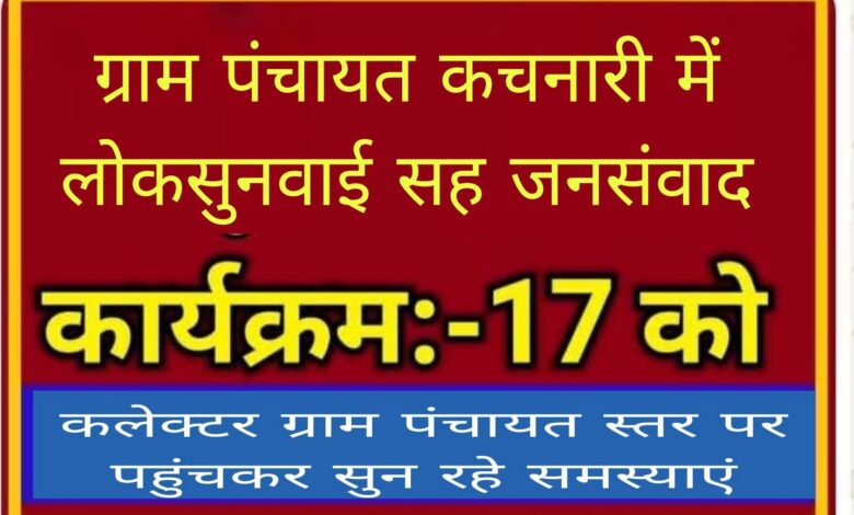 जनपद पंचायत ढीमरखेड़ा के ग्राम पंचायत कचनारी में आज साम 5 बजे होगा लोक सुनवाई सह जनसंवाद कार्यक्रम का आयोजन कलेक्टर ग्राम पंचायत स्तर पर पहुंच कर सुन रहें जनता की समस्याएं जनता के बीच पहुंच कर समस्याएं जानने और निराकरण की कलेक्टर श्री यादव की अभिनव पहल