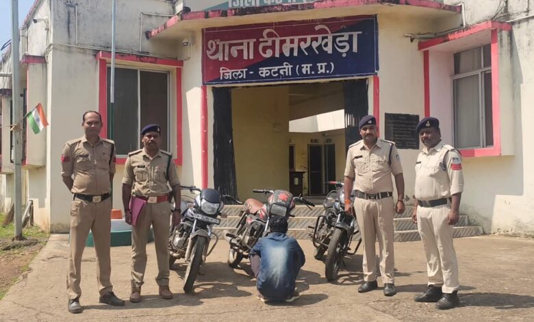 पुलिस अधीक्षक कटनी श्री अभिनय विश्वकर्मा के निर्देशन, अतिरिक्त पुलिस अधीक्षक डॉ. संतोष डेहरिया तथा एसडीओपी स्लीमनाबाद श्रीमती आकांक्षा चतुर्वेदी के मार्गदर्शन में ढीमरखेड़ा थाना पुलिस ने एक बड़ी सफलता हासिल करते हुए शातिर वाहन चोर को गिरफ्तार कर तीन चोरी की मोटरसाइकिलें बरामद की हैं।